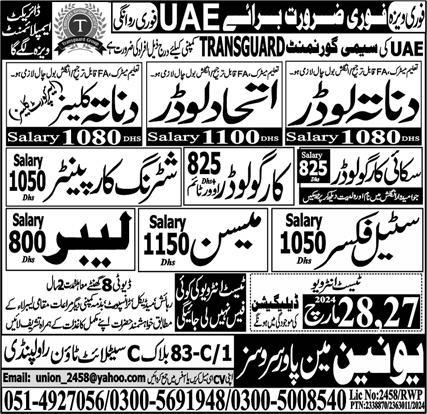Union Manpower Services invites applications for job positions advertised in daily Express dated 27 March 2024 for following vacancies in Sharjah, abu dhabi UAE.
