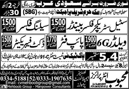 Mehboob Enterprises Overseas Employment Promoters is looking for candidates for following posts as per job advertisement published in daily Express Newspaper of September 3, 2022 for location Makkah, madina Saudi Arabia: