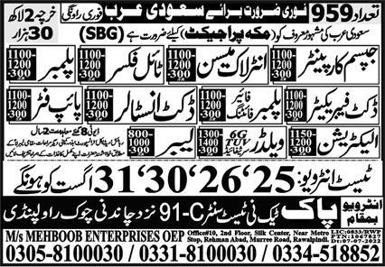 Vacant posts including docket fabricator, plumber, tile fixer, plumber firefighting, docket installer, electrician, gypsum carpenter, labor, pipe fitter, welder and interlock mason are announced in Pak Techni Test Center Makkah, riyadh Saudi Arabia as per 25 August 2022 advertisement in daily Express Newspaper. Preferred Education is Intermediate, Middle and Matric etc.
