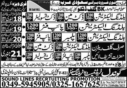Sound Lines Recruiting Promotion is looking for candidates for following posts as per job advertisement published in daily Express Newspaper of January 13, 2024 for location Riyadh, dammam Saudi Arabia: