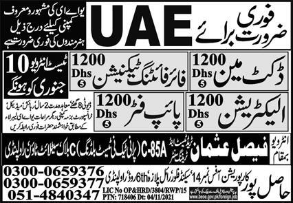 Faisal Usman Overseas Employment Promoters invites applications for job positions advertised in daily Express dated 8 January 2022 for following vacancies in UAE UAE.