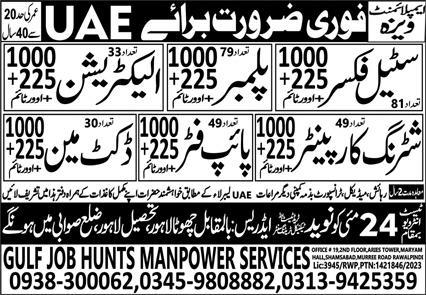 Naveed Trade Test & Technical Training Center jobs advertisement dated about 20 May 2023 in daily Express Newspaper invites application for the vacant post of plumber, shuttering carpenter, steel fixer, docket man, electrician and pipe fitter in Abu Dhabi, sharjah UAE. Persons with Matric and Intermediate etc. education can apply.