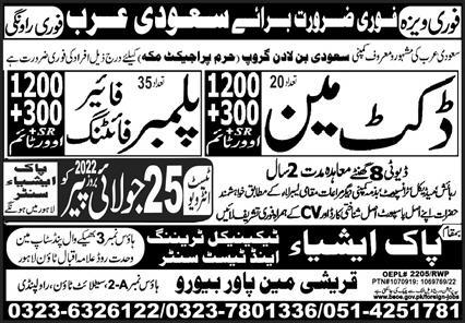 Pak Asia Technical Training Centre invites applications for job positions advertised in daily Express dated 22 July 2022 for following vacancies in Makkah, madina Saudi Arabia.