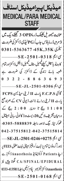 Private Hospital jobs advertisement dated about 13 January 2025 in daily Jang Newspaper invites application for the vacant post of dental doctor, doctor, fcps trainee and house job trainee in Lahore, lahore Punjab Pakistan. Educational qualifications required BDS, Intermediate and MBBS etc.