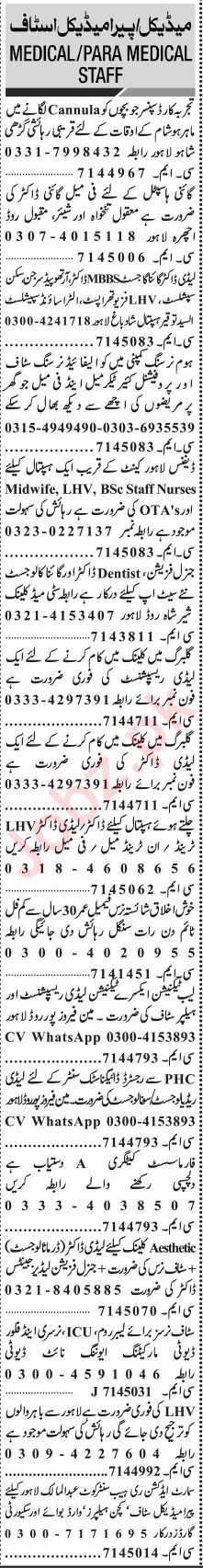 Vacant posts including skin specialist, gynaecologist, female gynae doctor, lady receptionist, female radiologist, security guard, nursing staff, dentist, care taker, ultrasound specialist, pharmacist, staff nurse, lady health visitor, dispenser, midwife, physiotherapist, orthopaedic surgeon and ward boy are announced in Private Hospital Lahore, lahore Punjab Pakistan as per 23 April 2024 advertisement in daily Jang Newspaper. Educational qualifications required Matric, MBBS, Intermediate and Others etc.