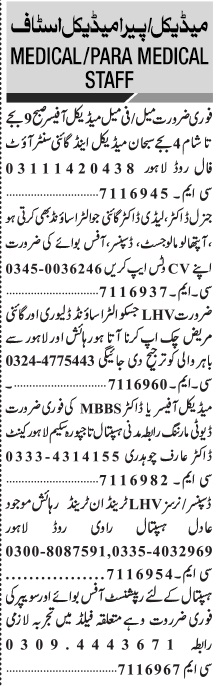 Private Hospital is looking for candidates for following posts as per job advertisement published in daily Jang Newspaper of May 8, 2022 for location Lahore, lahore Punjab Pakistan: