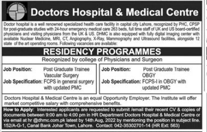 Doctor Hospital & Mecial Centre jobs advertisement dated about 12 August 2022 in daily Jang Newspaper invites application for the vacant post of residency program in Lahore, lahore Punjab Pakistan. Candidates with MBBS etc. educational background will be preferred.