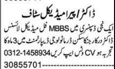 Dispensary Lahore, lahore Punjab Pakistan invites applications from eligible candidates for the post of doctor as per advertisement of July 17, 2023 published in daily Express Newspaper. Preferred Education is MBBS and Others etc.