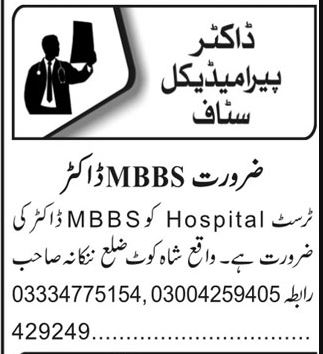 Trust Hospital invites applications for job positions advertised in daily Roznama 92 News dated 20 August 2024 for following vacancies in Nankana Sahib, shorkot Punjab Pakistan.