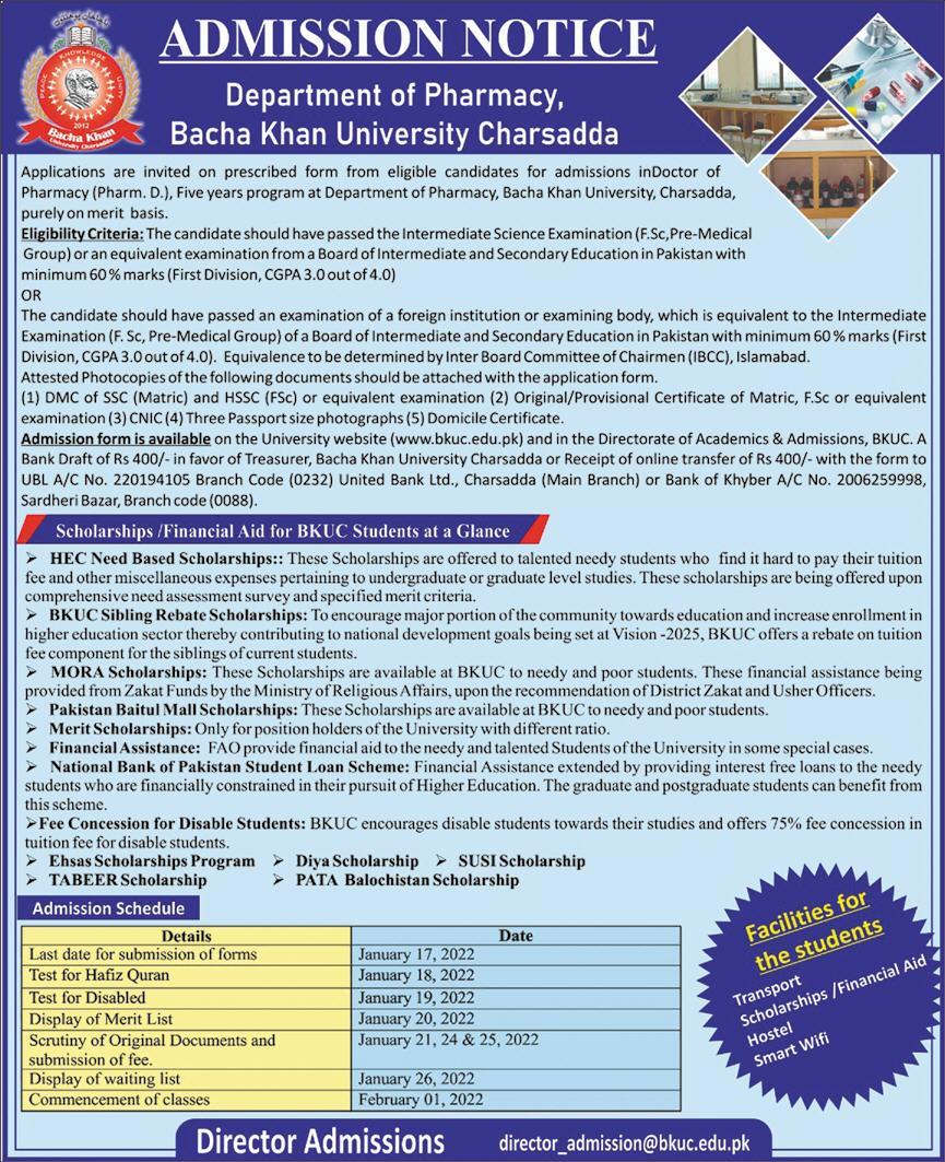 Doctor of Pharmacy Admissions at Bacha Khan University Charsadda