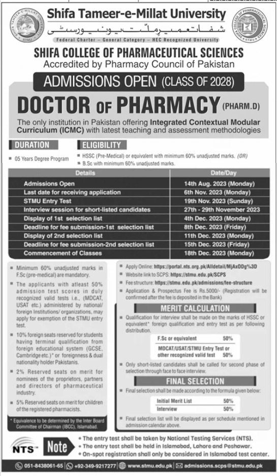 Shifa Tameer e Millat University STMU Doctor of Pharmacy Pharm D admissions 2023 has been started. Shifa Tameer e Millat University STMU Islamabad Islamabad Pakistan welcomes students to apply for admissions in academic year 2023 in Medical University. Students for admissions in Pharm D can apply for online or campus classes as per Private institute criteria till admission closing date November 6, 2023. Read newspaper ad for exact details.