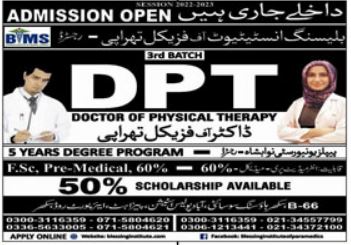 Blessing Institute of Physical Therapy admissions 2023 for Doctor of Physical Therapy DPT has been announced. Eligible students who qualify as per admission criteria in Blessing Institute of Physical Therapy Sukkur Sindh Pakistan can apply in Medical College for academic year 2023. Eligible students for fulfilling criteria for admissions in DPT can enroll as per Private admission policy 2023 till closing date 12 April 2023. Read newspaper ad for exact details.
