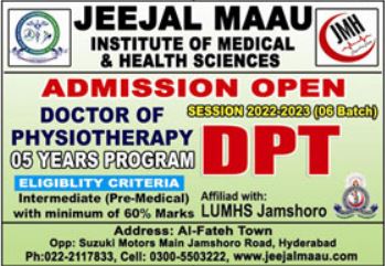 Jeejal Maau Institute of Medical & Health Sciences admissions 2023 for Doctor of Physical Therapy DPT has been announced. Jeejal Maau Institute of Medical & Health Sciences Hyderabad Sindh Pakistan welcomes students to apply for admissions in academic year 2023 in Medical University. Students for admissions in DPT can apply for online or campus classes as per Private institute criteria till admission closing date February 8, 2023. Read newspaper ad for exact details.