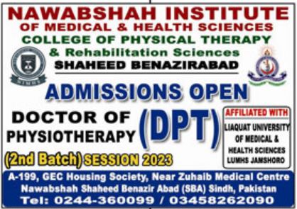 Nawabshah Institute of Medical and Health Sciences Doctor of Physiotherapy DPT admissions 2023 has been started. Eligible students who qualify as per admission criteria in Nawabshah Institute of Medical and Health Sciences Nawabshah Sindh Pakistan can apply in Medical University for academic year 2023. Students for admissions in DPT & criteria can apply as per Private institute admission policy 2023 before closing date March 19, 2023 as per advertisement. Read newspaper ad for exact details.