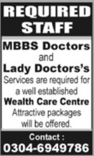 Wealth Care Centre invites applications for job positions advertised in daily Khabrain dated 4 May 2025 for following vacancies in Multan, multan Punjab Pakistan.