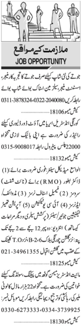 Vacant posts including staff nurse, midwife, outdoor delivery rider, icu technician, rider, resident medical officer, delivery rider, salesman, aid nurse, stock boy, operation theater technician, doctor, ot technician, packing worker, assistant manager, manager, nurse, rmo and shop boy are announced in Private Company Karachi, karachi Sindh Pakistan as per 12 April 2022 advertisement in daily Jang Newspaper. Matric, Bachelor, Intermediate, Others, MBBS and Middle etc. educational qualification will be preferred.