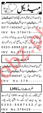 Nurse, LHV, Doctor, Lady Doctor, Pharmacist, Midwives, Gynecologist, Receptionist, Dispenser, Resident Medical Officer, Pathologist, ICU Technician, CT Scan Technician, X Ray Technician, House Officer, Nursing Instructor, CCTV Assistant, Lab Technician seeks in well developed hospitals.