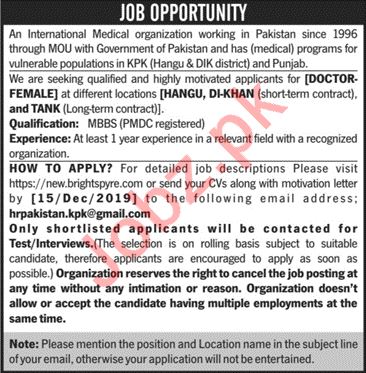 Doctors Jobs 2019 For Hangu, Tank & DI Khan KPK