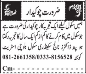 Doctors Knowledge Secondary School invites applications for job positions advertised in daily Jang dated 15 July 2025 for following vacancies in Baloch Colony Quetta, quetta Balochistan Pakistan.