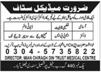 Doctors Required At Mian Chiragh Din Trust Medical Centre