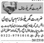Vacant posts including maid, aya, driver, house keeper and house servant are announced in Private Company Lahore, lahore Punjab Pakistan as per 26 January 2023 advertisement in daily Dunya Newspaper. Persons with Primary, Middle, Matric and Intermediate etc. education can apply.