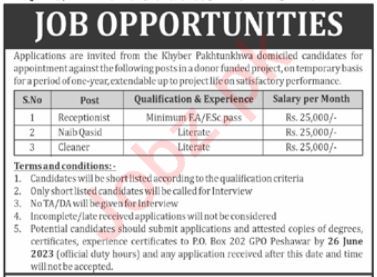 Donor Funded Project jobs advertisement dated about 11 June 2023 in daily Aaj Newspaper invites application for the vacant post of cleaner, naib qasid and receptionist in Peshawar, peshawar Khyber Pakhtunkhwa KPK Pakistan. Persons with Matric, Intermediate and Middle etc. education can apply.