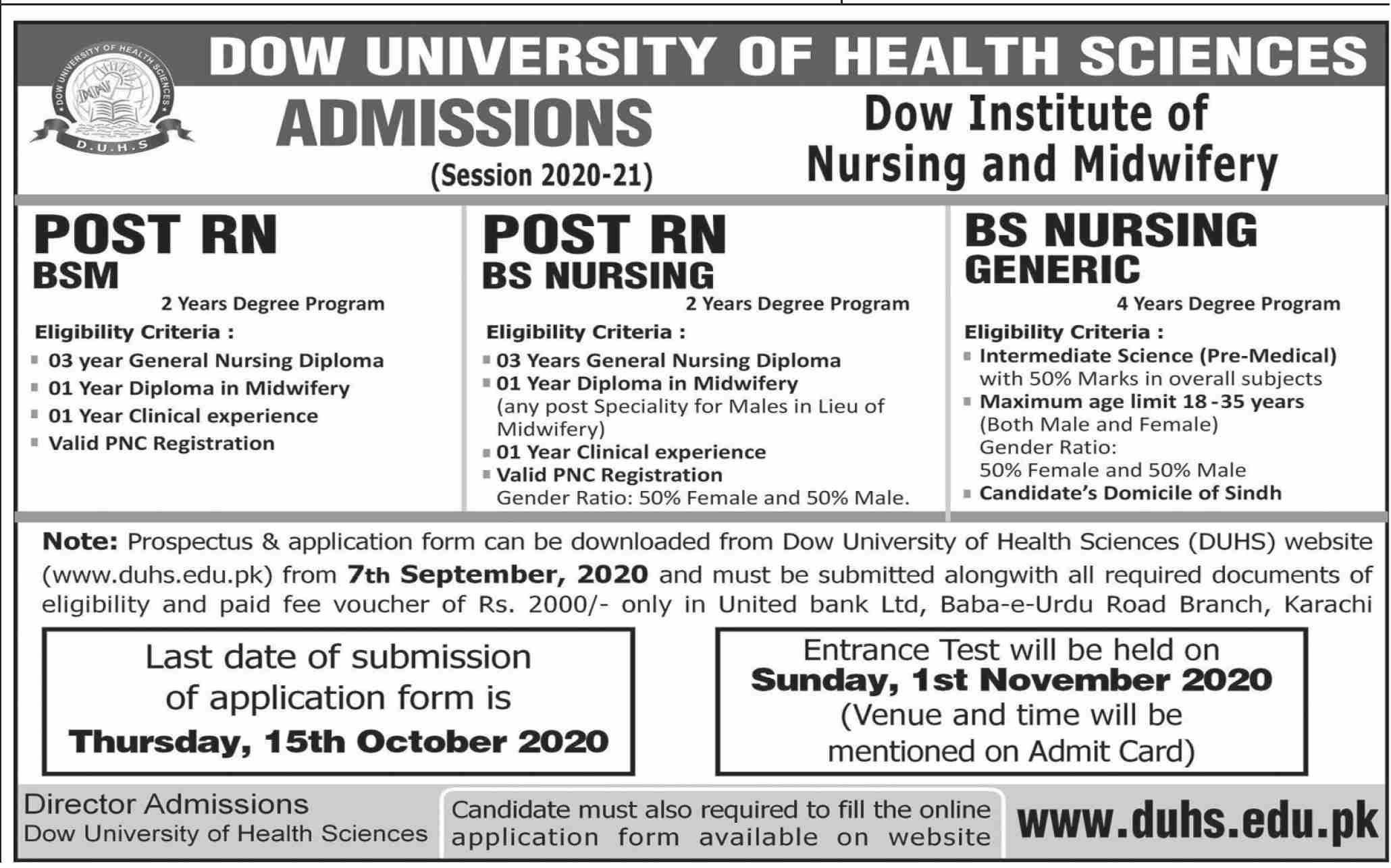Dow Institute of Nursing And Midwifery, Dow University of Health Sciences DUHS is offering admissions in Post RN BSM Degree Program, Post RN BS Nursing Degree Program and BS Nursing Generic Degree Program. Read newspaper ad for exact details.