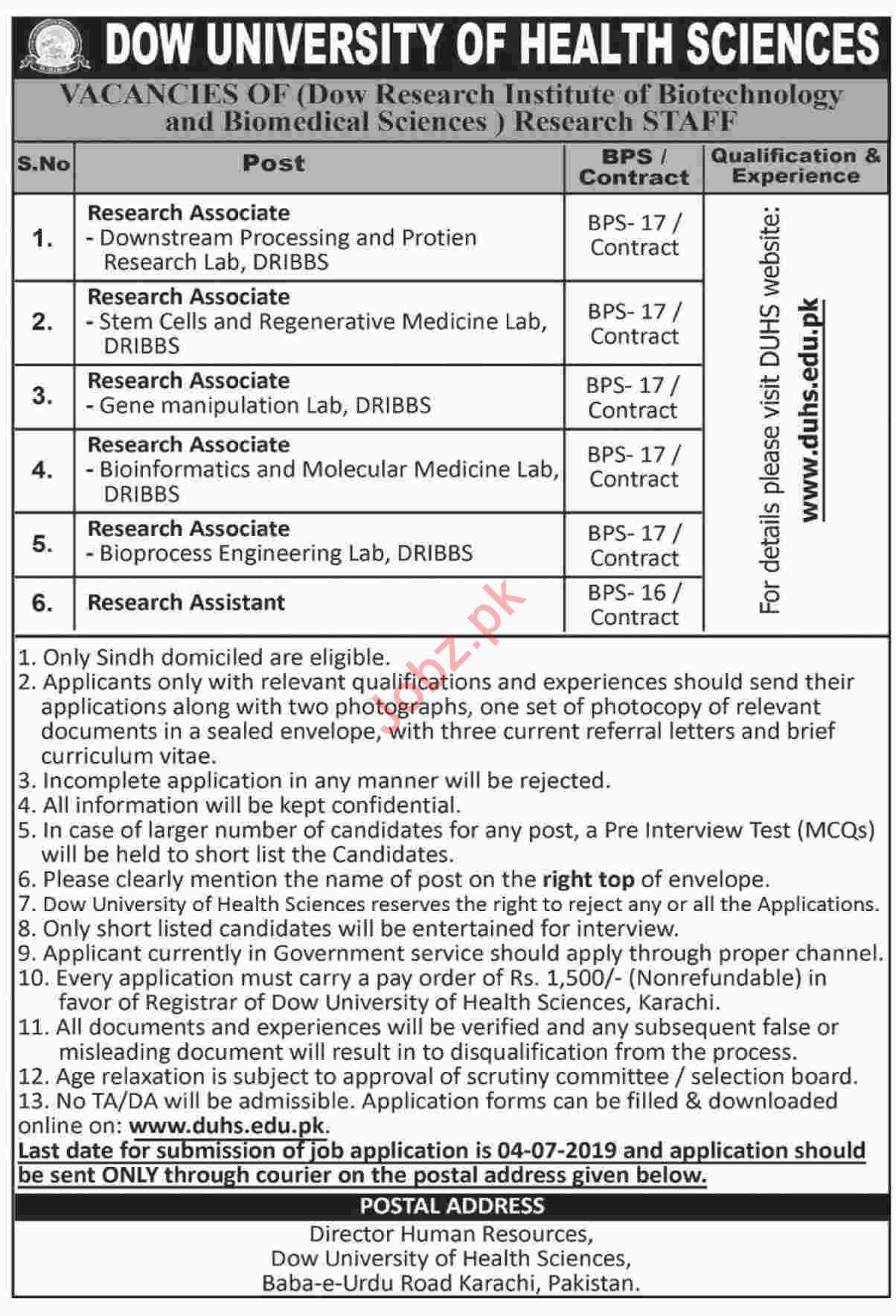 Vacancies in Dow University of Health and Sciences Advertisement June 2019