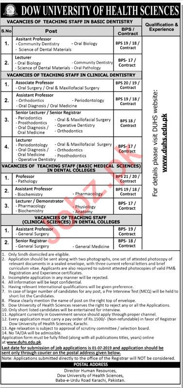 Dow University of Health and Sciences is looking for highly qualified and experienced candidates for the posts of Assistant Professor Community Dentistry, Assistant Professor Oral Biology, Assistant Professor Science of Dental Material.Assistant Professor Oral Surgery, Assistant Professor Oral Maxillary surgery, Assistant Professor Biochemistry, Assistant Professor Pharmacology, Assistant Professor General Surgery, , Associate Professor, Periodontics, Orthodontics Lecturer, Oral Diagnosis Lecturer, Operative Dentistry Lecturer, Registrar, Demonstrator in Karachi.Candidates can apply till July 1, 2019.