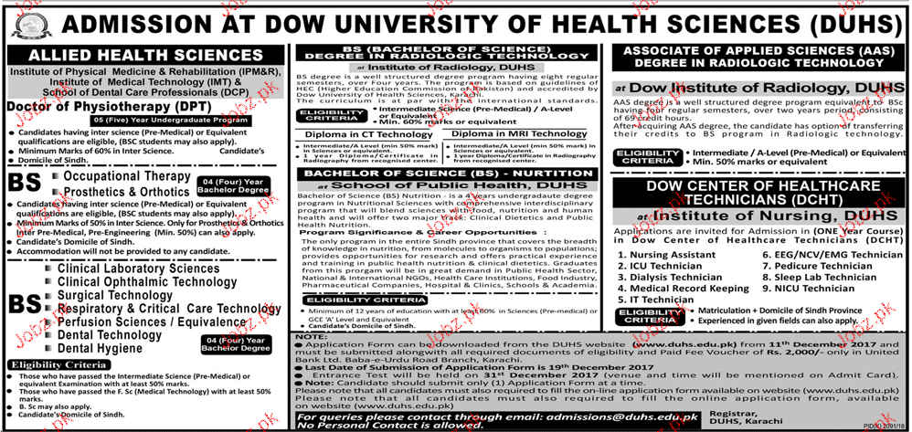 Dow University of Health Science Admission in Doctor of Physical Therapy DPT, BS Occupational Therapy, BS Clinical Laboratory Technology, Surgical Technologies in Karachi. Read newspaper ad for exact details.