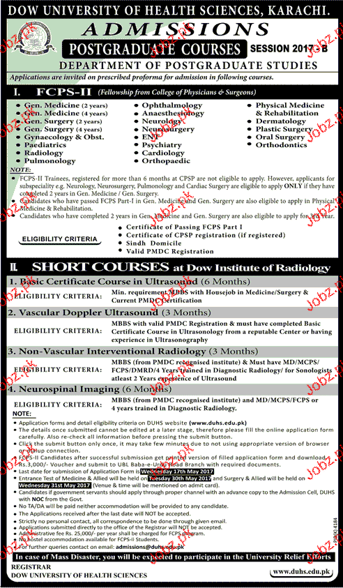 Dow University of Health Science Admission in FCPS in Karachi. Read newspaper ad for exact details.