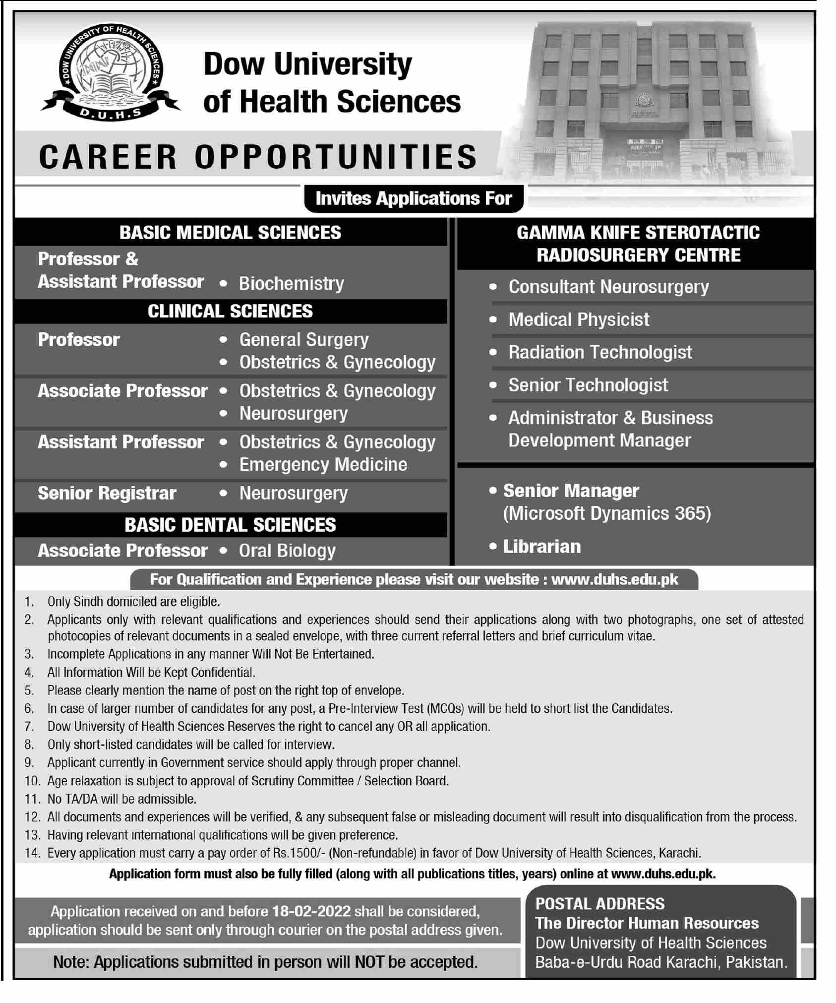 Dow University of Health and Sciences Karachi Sindh Pakistan invites applications from eligible candidates for the post of Associate professor Obstetrics Gynecology, Associate Professor Oral Biology, Registrar Neurosurgery, Consultant Neurosurgery, Medical Physicist, Assistant Professor Emergency Medicine, Radiation Technologist, professor Obstetrics Gynaecology, Manager Microsoft Dynamics 365, Biochemistry Professor, Professor General Surgery, Associate Professor Neurosurgery, Technologist, Professor, Librarian, Business Development Manager, Administrator, Assistant Professor Obstetrics Gynaecology and Assistant Professor Biochemistry as per advertisement of February 2, 2022 published in daily Dawn Newspaper. Educational qualifications required Others, MS, Phd, MBBS and Mphil etc.