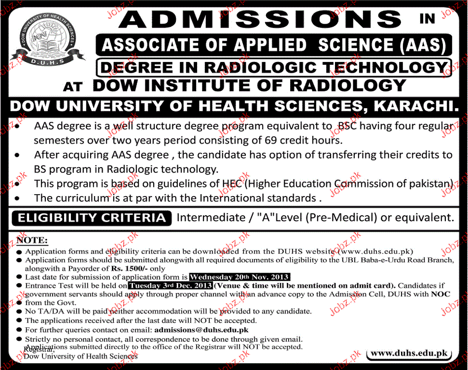 DOW University of Health Sciences Admission in AAS in Karachi Read newspaper ad for exact details.