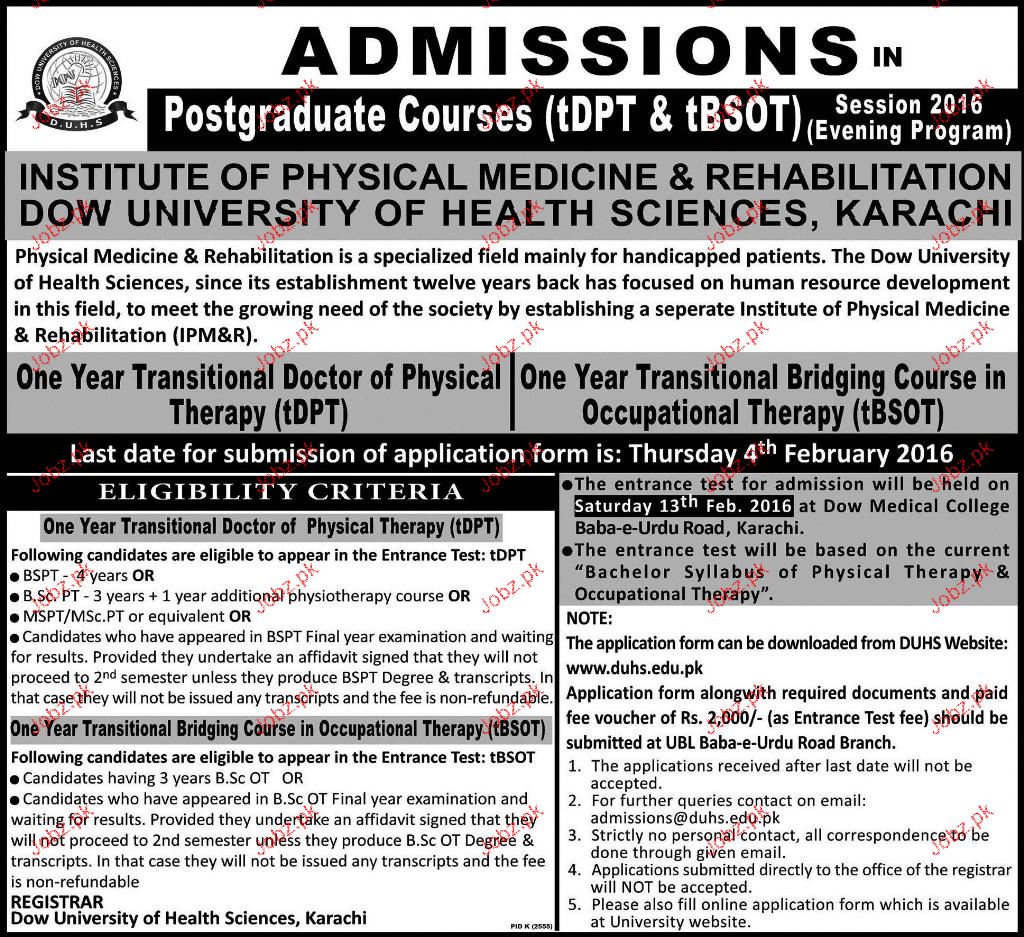 Dow University of Health Sciences Admission in BSOT in Karachi. Read newspaper ad for exact details.