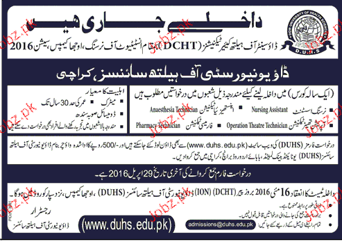 Dow University of Health Sciences Admission in Courses in karachi. Read newspaper ad for exact details.