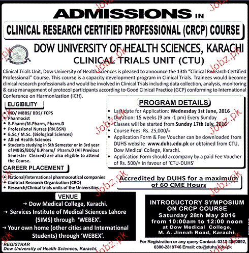 Dow University of Health Sciences Admission in Courses in Karachi. Read newspaper ad for exact details.