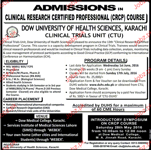 Dow University of Health Sciences Admission in Diploma in karachi. Read newspaper ad for exact details.