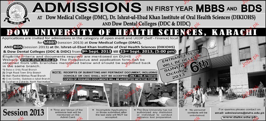 DOW University of Health Sciences Admission in MBBS and BDS in Karachi Read newspaper ad for exact details.