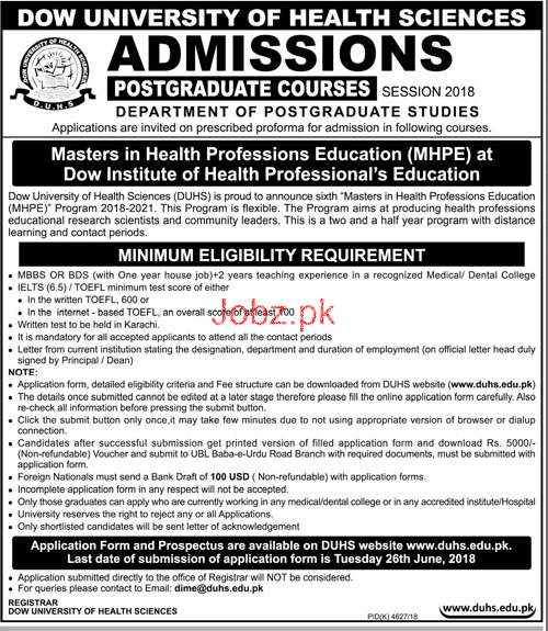 Dow University of Health Sciences Admission in Postgraduate Courses PGD Session 2018, Master in Health Professions Education MHPE at Down Institute of Health Professionals Educaiton in Karachi. Read newspaper ad for exact details.