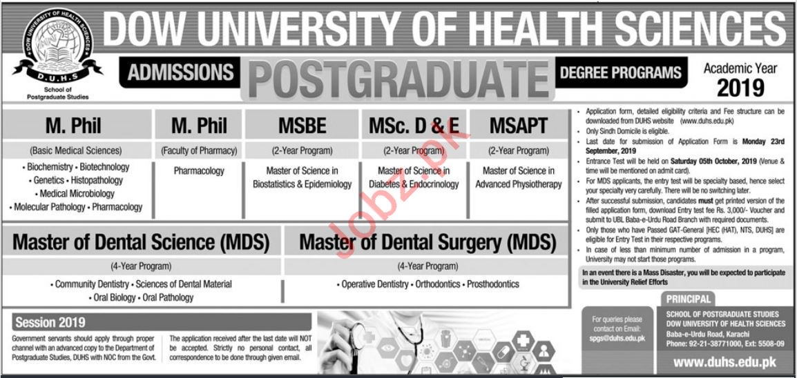Dow University of Health Sciences offers admissions in M.Phil in Biochemistry, Biotechnology, Genetics, Medical Microbiology, Pharmacology, Masters of Science in Bio statistics and Epidemiology, Masters of Science in Diabetes and Endocrinology, Masters of Science in Advanced Physiotherapy in Karachi. Read newspaper ad for exact details.