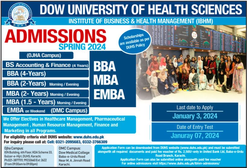 Dow University of Health Sciences BA Accounting and Finance, BBA, MBA, Executive MBA admissions 2023 has been announced. Eligible students who qualify as per admission criteria in Dow University of Health Sciences Karachi Sindh Pakistan can apply in Science University for academic year 2023. Eligible candidates for admissions in MBA, BS and BBA can apply as per Government institute criteria and before closing date 3 January 2024 after reading advertisement online. Read newspaper ad for exact details.