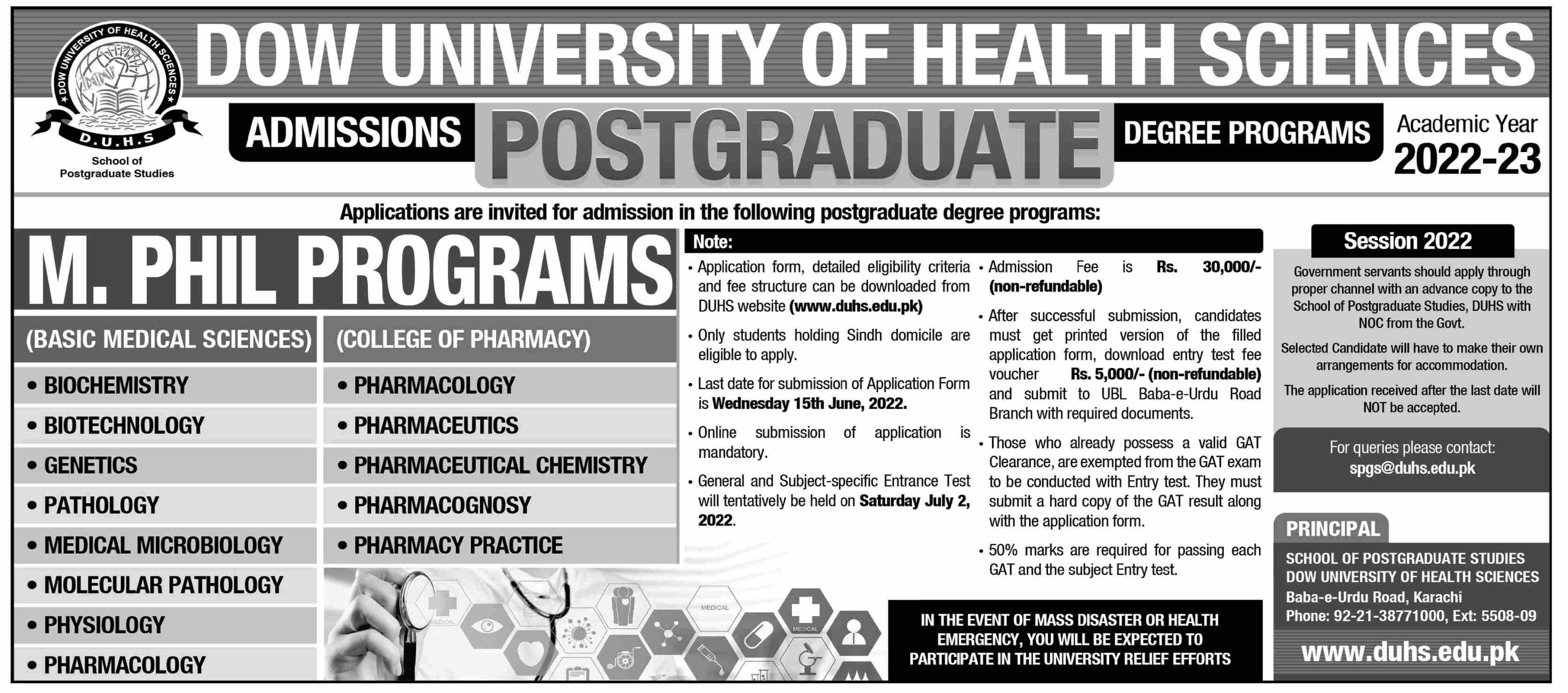 Dow University of Health Sciences Biochemistry, Pharmacology, Biotechnology, Pharmaceutics, Genetics, Pathology, Pharmacognosy, Medical Microbiology, Pharmacy Practice, Molecular Pathology, Physiology, Pharmacology admissions 2022 has been announced. Eligible students who qualify as per admission criteria in Dow University of Health Sciences Karachi Sindh Pakistan can apply in Medical University for academic year 2022. Eligible students for fulfilling criteria for admissions in Mphil can enroll as per Government admission policy 2022 till closing date 15 June 2022. Read newspaper ad for exact details.