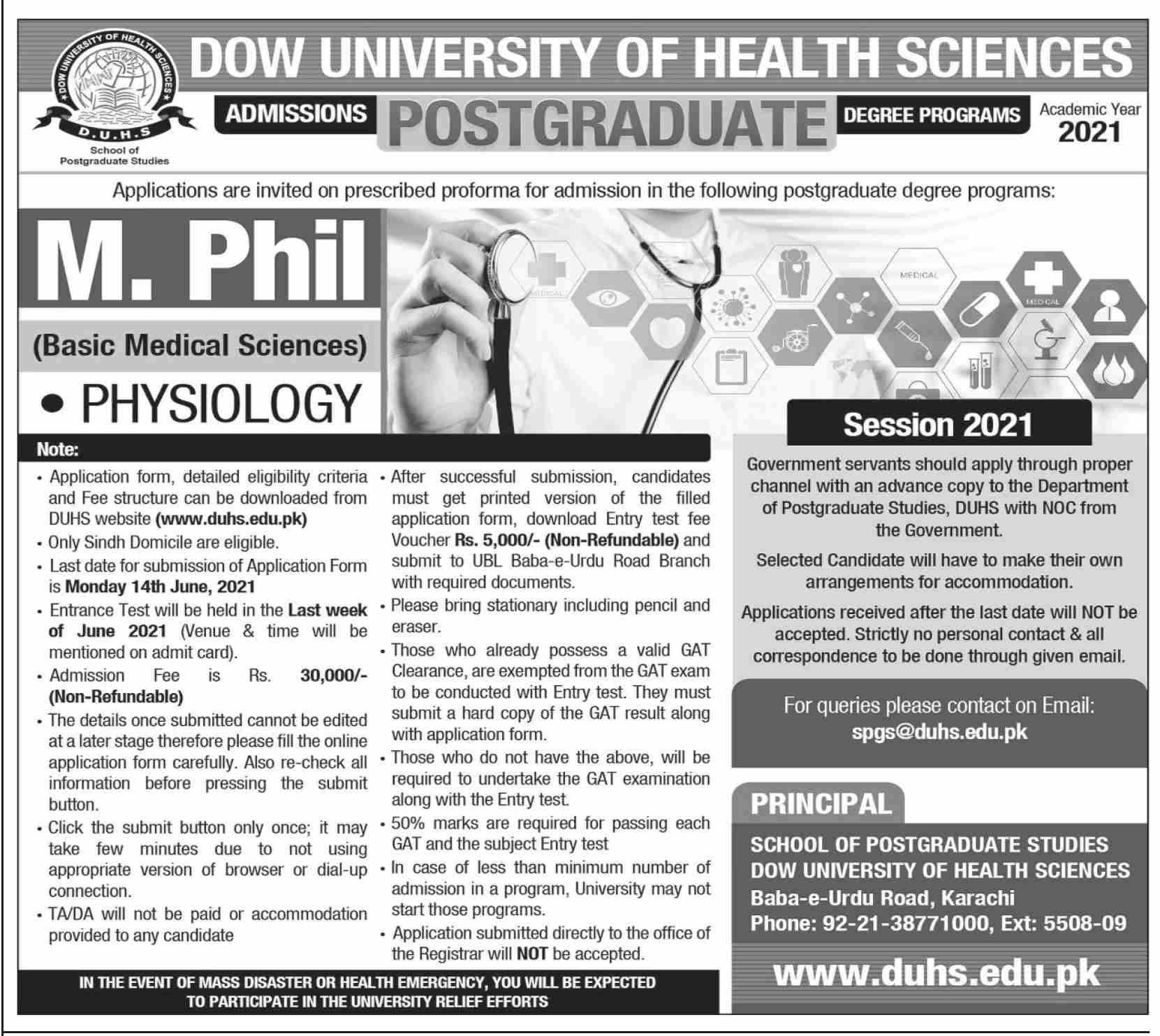 Dow University of Health Sciences DUHS is a public medical university has announced online admissions in Master of Philosophy M.Phil Physiology Degree Programs in Karachi 2021. Read newspaper ad for exact details.