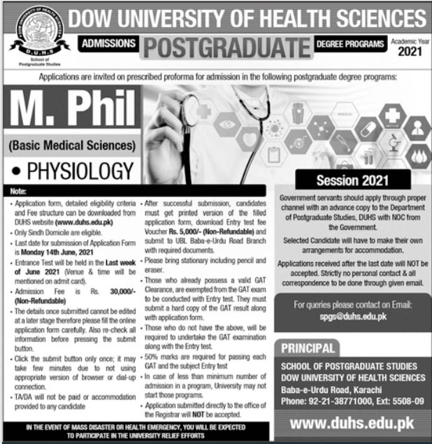 School of Postgraduate Studies, Dow University of Health Sciences DUHS is a public medical university invites applications for admission in M.Phil Physiology in Karachi Sindh Pakistan 2021. Read newspaper ad for exact details.