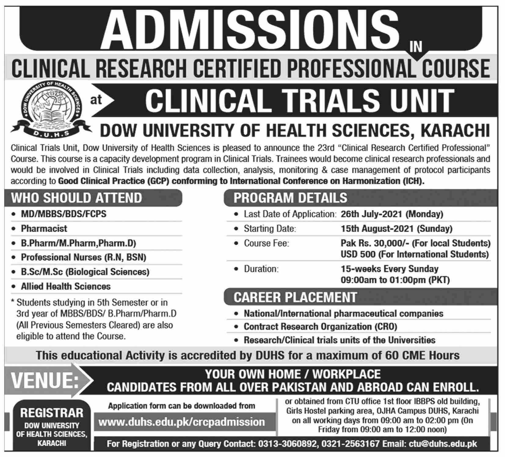 Dow University of Health Sciences DUHS is a public sector university is offering admissions in Clinical Research Certified Professional Course in Karachi. Read newspaper ad for exact details.