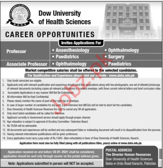 Dow University of Health & Sciences DUHS Karachi, Government of the Sindh is looking for the services from experienced candidates for the posts of Professor, Associate Professor, Professor Anaesthesiology, Professor Ophthalmology, Professor Paediatrics, Professor Surgery.