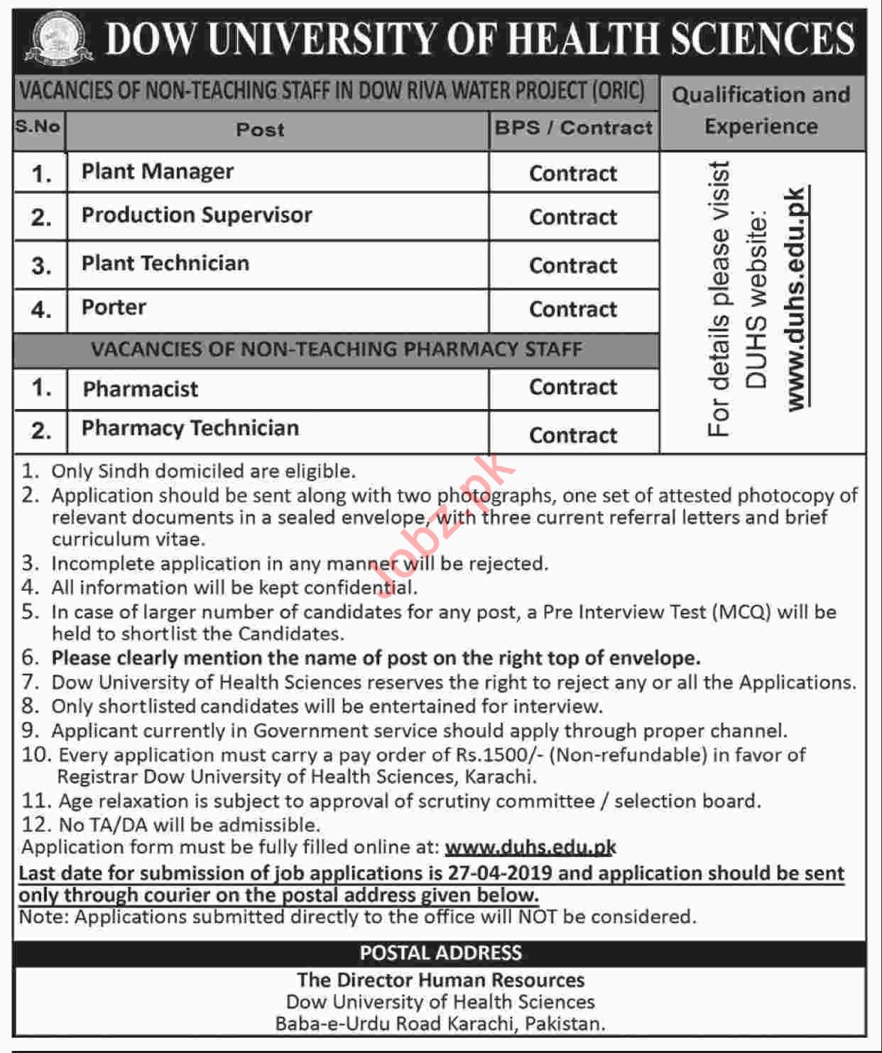Vacancies in Dow University of Health and Sciences Advertisement April 2019