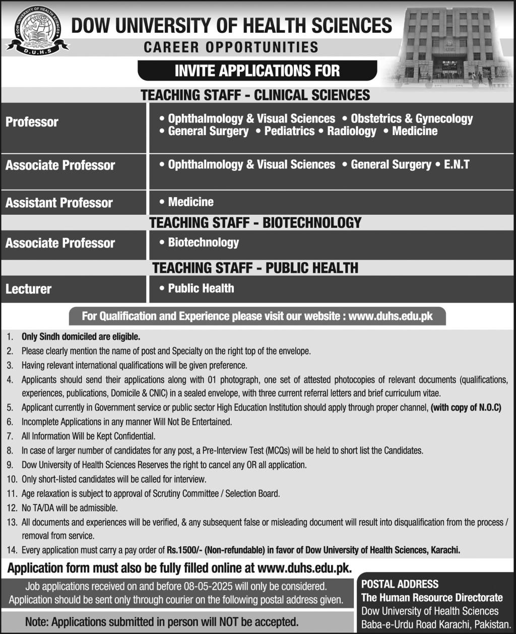 Vacancies in Dow University of Health Sciences Advertisement April 2025