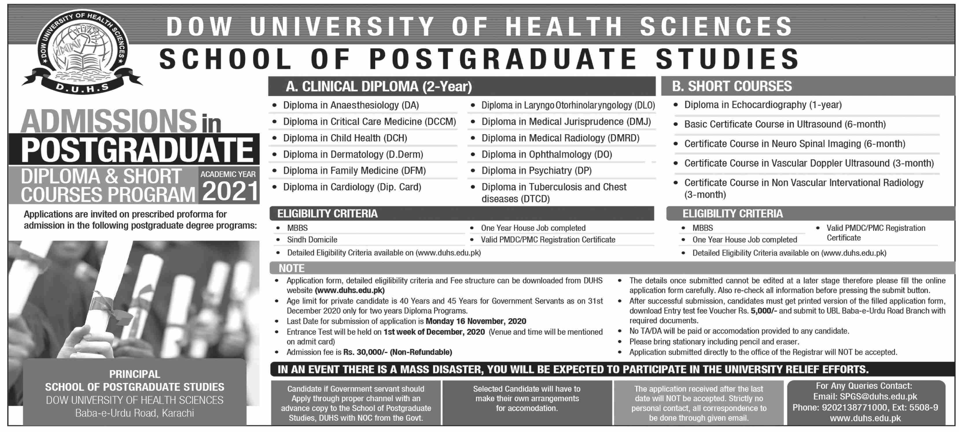 Dow University of Health Sciences DUHS, School of Postgraduate Studies has announced admissions for Clinical Diploma and Short Courses in Karachi Sindh. Read newspaper ad for exact details.