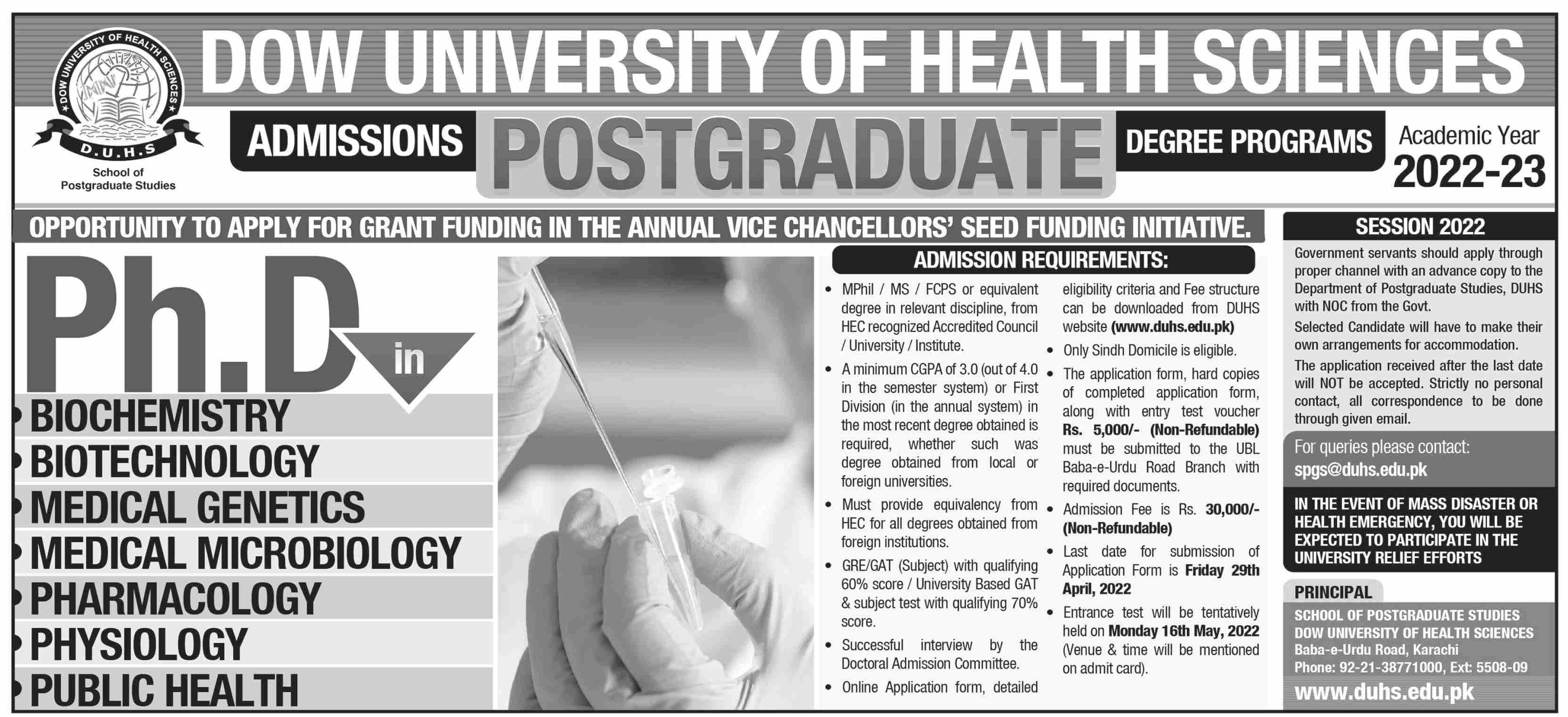 Dow University of Health Sciences PhD in Biochemistry, Biotechnology, Medical Genetics, Medical Microbiology, Pharmacology, Physiology, Public Health, admissions 2022 has been started. Eligible students can apply for academic admissions 2022 in Dow University of Health Sciences Karachi Sindh Pakistan for Science Phd. Students for admissions in Phd & criteria can apply as per Government institute admission policy 2022 before closing date April 29, 2022 as per advertisement. Read newspaper ad for exact details.
